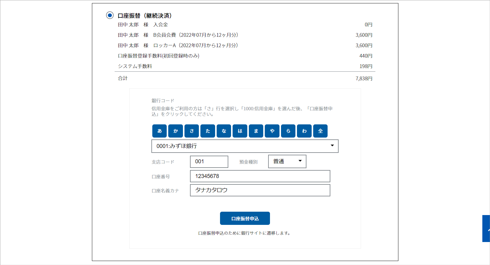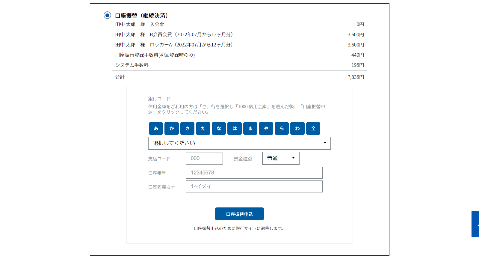 ②口座情報を入力し、「口座振替申込」をクリックします。